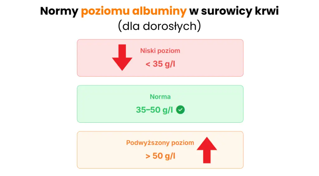 - Norma dla dorosłych wynosi 35–50 g/l, ale jej interpretacja zależy od stanu klinicznego pacjenta i innych parametrów laboratoryjnych.