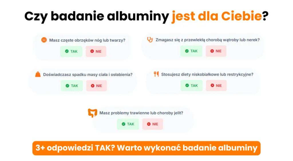 Badanie poziomu albuminy w surowicy jest proste, ale niezwykle pomocne w diagnostyce wielu schorzeń. Powinno zostać wykonane w sytuacjach, gdy istnieje podejrzenie zaburzeń metabolicznych, chorób przewlekłych lub stanów niedożywienia. Szczególnie zaleca się je następującym grupom: