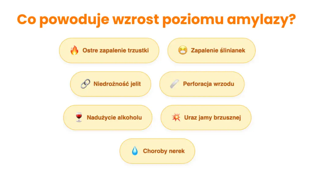 - Podwyższony poziom amylazy może świadczyć o zapaleniu trzustki, chorobach ślinianek, urazach jamy brzusznej lub niedrożności jelit.