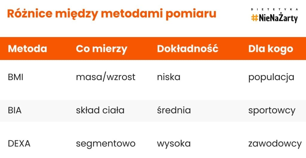 - Najlepsze efekty daje połączenie BMI z innymi pomiarami, takimi jak BIA, RFM, WHR czy DEXA – dopiero wtedy widać pełny obraz składu ciała.