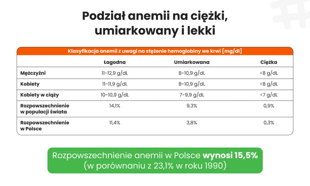 Warto również wiedzieć o podziale anemii na ciężką, umiarkowaną i lekką. Grafika poniżej przedstawia jakie wartości hemoglobiny wskazują na określony rodzaj anemii. Jak widać, chociażby ciężka anemia jest diagnozowana u kobiet i mężczyzn, gdy stężenie hemoglobiny spadnie poniżej 8 g/dL. Co więcej, rozpowszechnienie ciężkiej anemii w Polsce wynosi 0,3%, gdzie na świecie jest to już aż 0,9% [1].