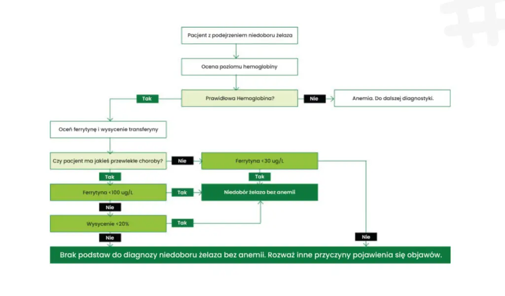 Warto również wspomnieć, iż można odczuwać negatywne objawy (więcej o objawach anemii przeczytasz w nagłówku niżej) np. zmęczenie, pogorszenie formy sportowej bez jawnej anemii tj.w wyniku hemoglobiny w normie, w dolnej wartości zakresu referencyjnego. Wtedy możemy mówić o niedoborze żelaza bez anemii (IDWA). Sposób diagnozy niedoboru żelaza bez anemii przedstawiony jest poniżej.