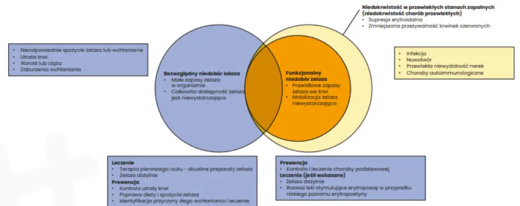 - Leczenie (jeżeli wskazane) – żelazo dożylne, rozważenie leków stymulujących erytropoezę w przypadku niskiego poziomu erytropoetyny.