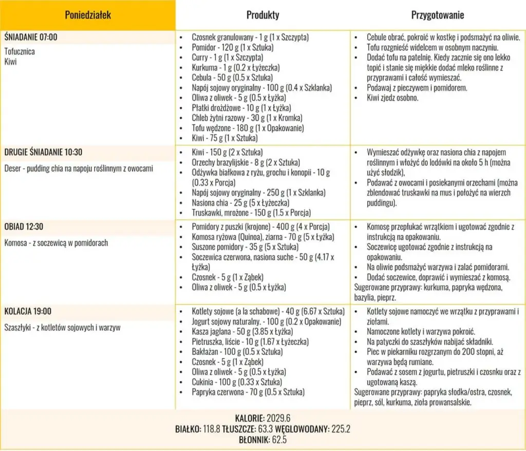 Przygotowaliśmy dla Ciebie przykładowy jadłospis na anemię. Jest w pełni wegański, ale uwaga – zawiera on aż 33,9 mg żelaza! Pamiętaj o czynnikach wpływających na zwiększenie żelaza z pożywienia np. sok pomarańczowy do posiłku. Sam jadłospis na anemie zawiera 2000 kcal, 120 g białka, 225 g węglowodanów, oraz aż 62,5 g błonnika, dzięki czemu również świetnie sprawdzi się na redukcję masy ciała.