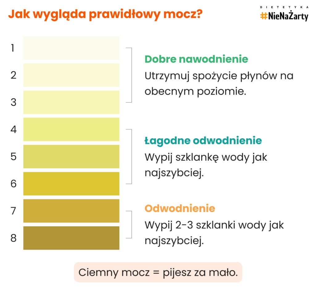 Najprostszym wyznacznikiem jest ilość oddawanego moczu – powinna wynosić co najmniej 2–2,5 litra na dobę. Jeśli mocz jest jasny i oddawany regularnie, to dobry znak.