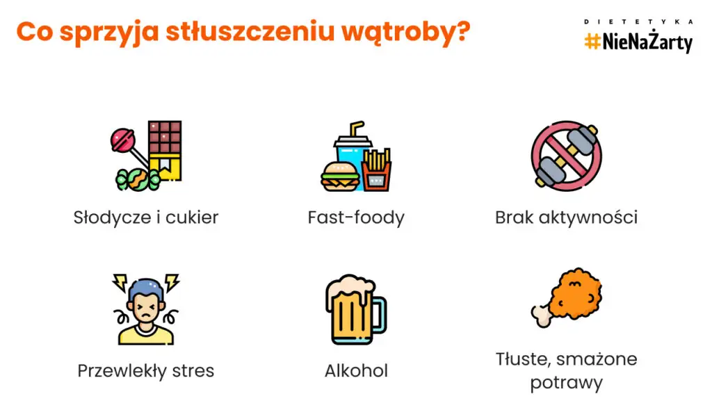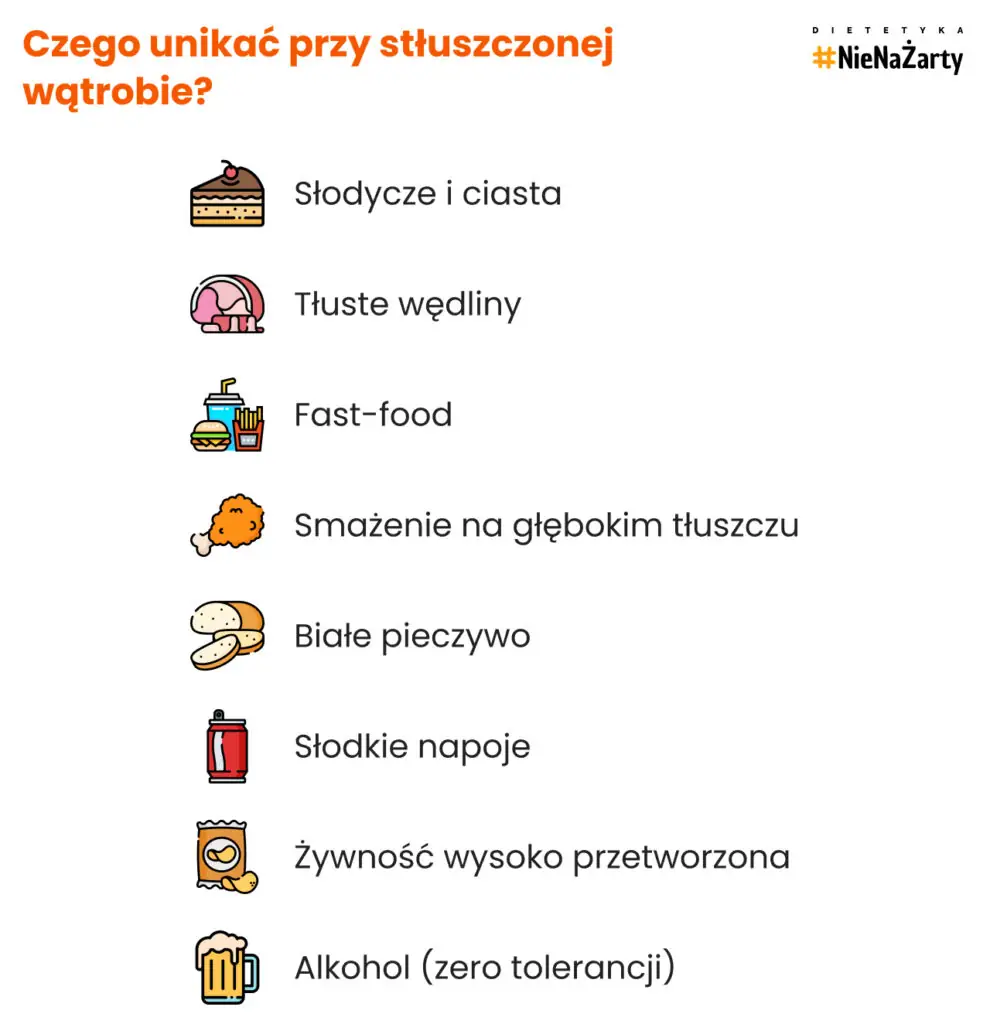- W stłuszczeniu wątroby należy unikać alkoholu, potraw smażonych i słodyczy.