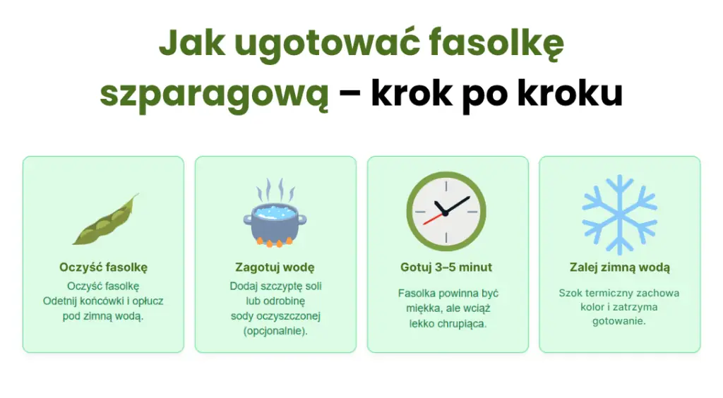 3. Gotowanie w osolonej wodzie – gotuj fasolkę przez 3–5 minut, aż będzie miękka, ale wciąż lekko chrupiąca. Zbyt długie gotowanie powoduje utratę witamin – szczególnie witamin z grupy B i witaminy C.