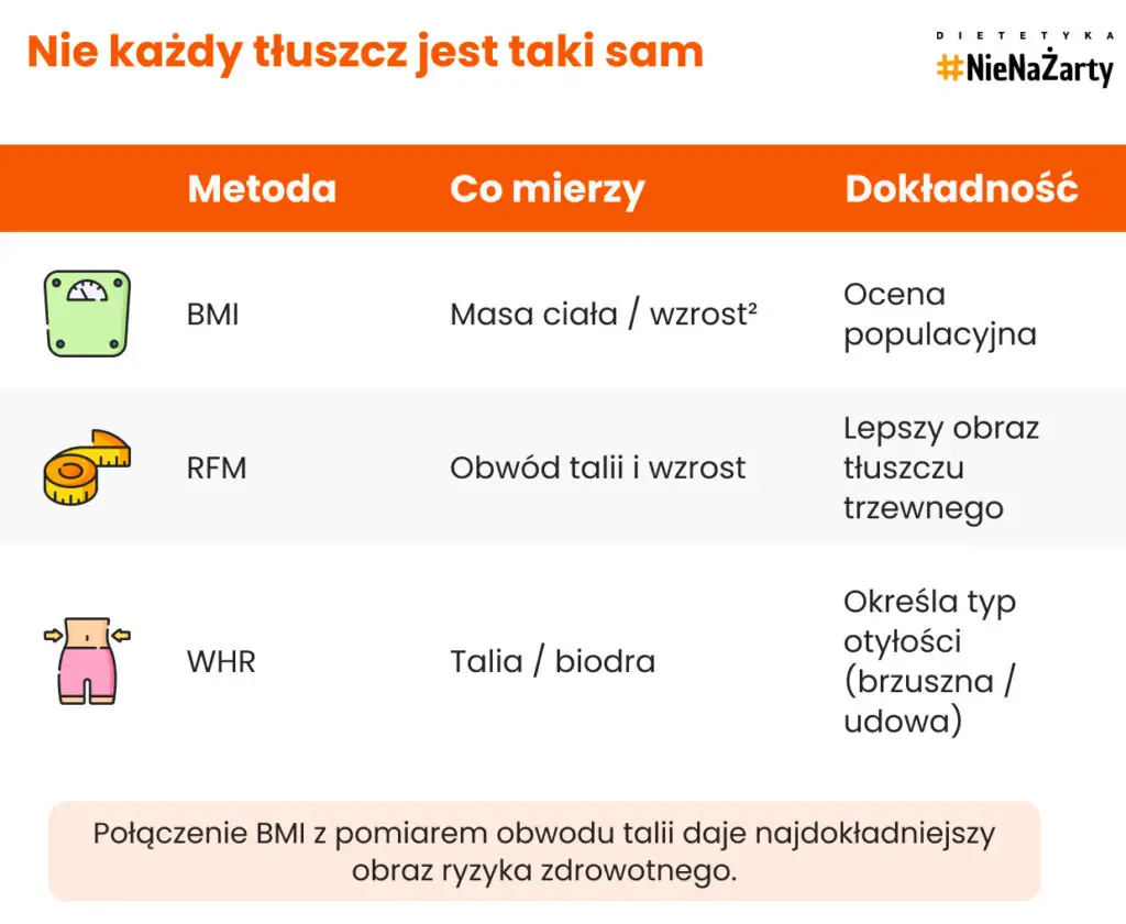 - Połączenie BMI z obwodem talii i wskaźnikiem RFM pozwala najtrafniej ocenić ryzyko metaboliczne.