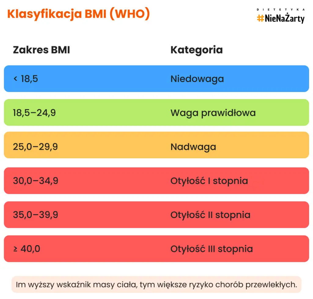 - BMI < 18,5 – niedowaga,