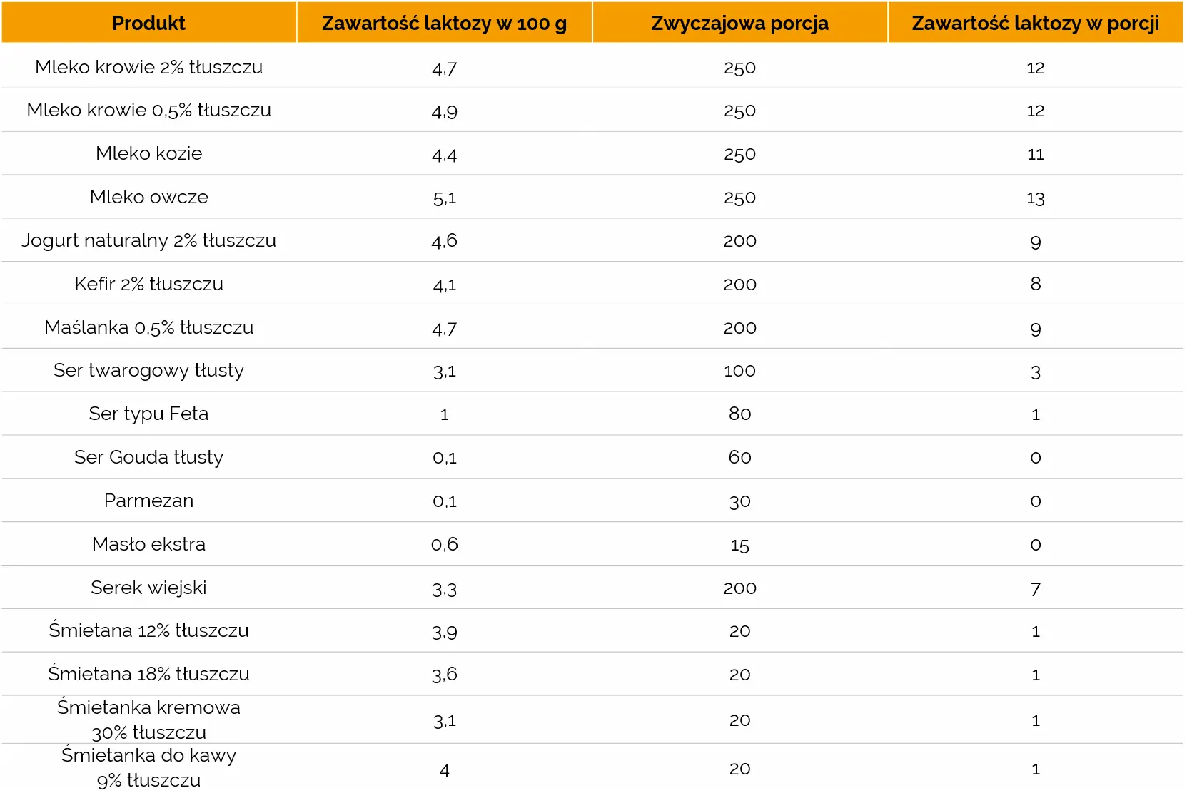 No i na sam koniec przygotowałem dla Ciebie małą tabelę. Jak widzisz nie wszystkie produkty zawierają taką samą ilość laktozy. Oznacza to, że niektóre produkty mleczne spożywane w zwyczajowych ilościach mogą być teoretycznie dobrze tolerowane przez osoby z nietolerancją laktozy. Poza tym na półkach sklepowych znajdziesz również produkty mleczne bez laktozy (cukier jest już rozłożony do glukozy oraz galaktozy), w związku z tym nie musisz rezygnować z nabiału, nawet jeżeli nie tolerujesz niewielkich ilości laktozy.