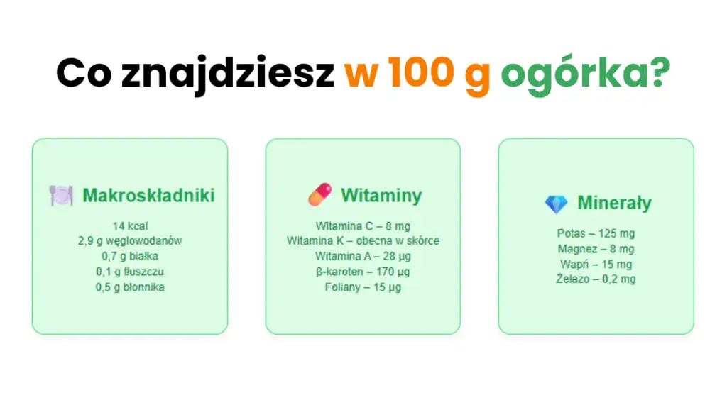 - 100 g ogórków małosolnych to około 15–18 kcal.