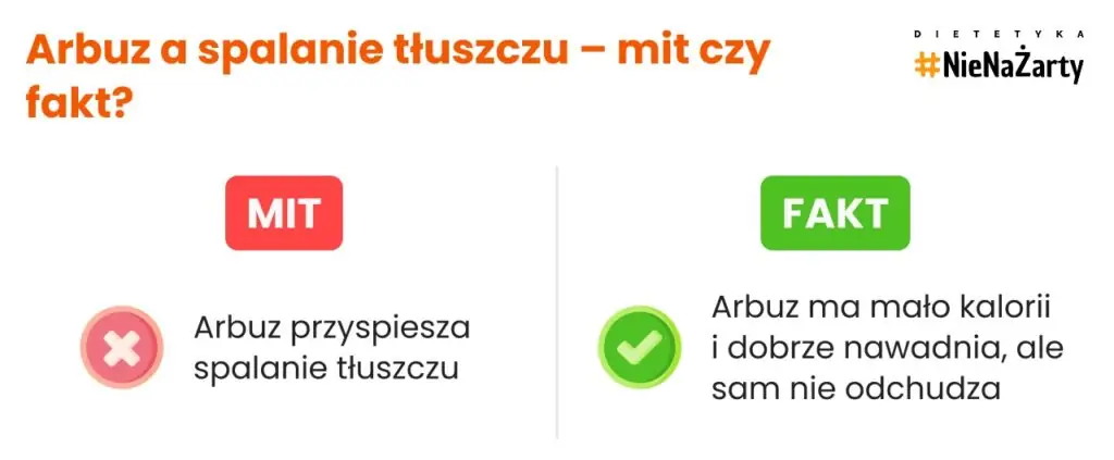 Arbuz nie spala tłuszczu i nie przyspiesza odchudzania – to mit. Ale dzięki temu, że ma tylko 30–36 kcal w 100 g i dużo wody, może być pomocny w diecie redukcyjnej. Zamiast batonika czy słodkiego napoju – plaster arbuza to dobry wybór. Uczucie sytości? Tak. Spalanie tłuszczu? Nie.