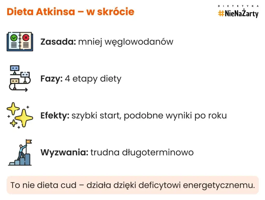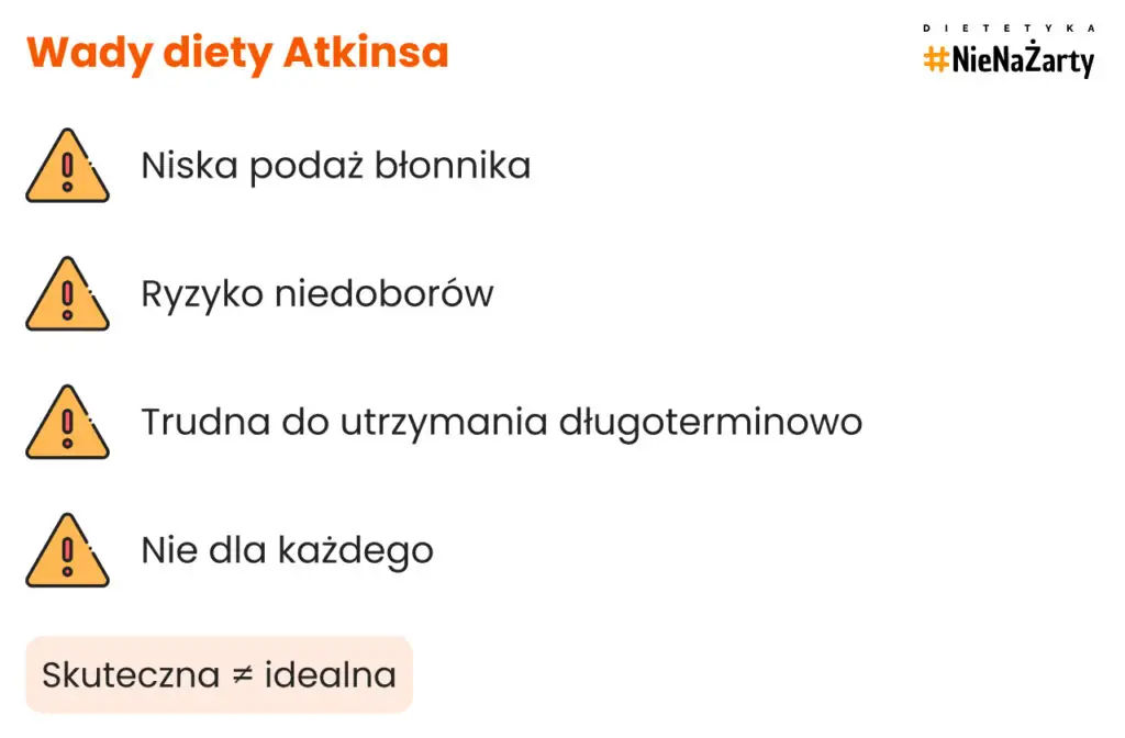 • Posiada udokumentowane wady diety Atkinsa, w tym trudności z długoterminowym stosowaniem oraz ryzyko niedoborów.