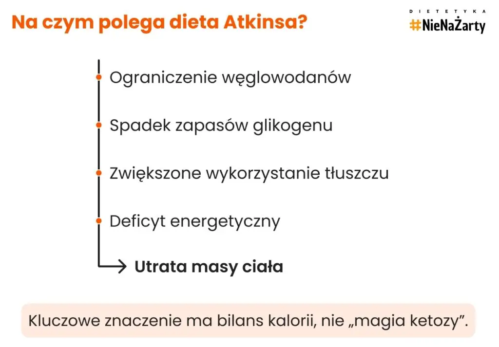 To właśnie ograniczenie spożycia węglowodanów sprawia, że jadłospis staje się prostszy i często mniej kaloryczny. Szybkie efekty diety Atkinsa wynikają więc głównie z tego, że przy takiej liście produktów łatwiej o deficyt energetyczny, a nie z samego faktu wykluczenia konkretnej grupy żywności.