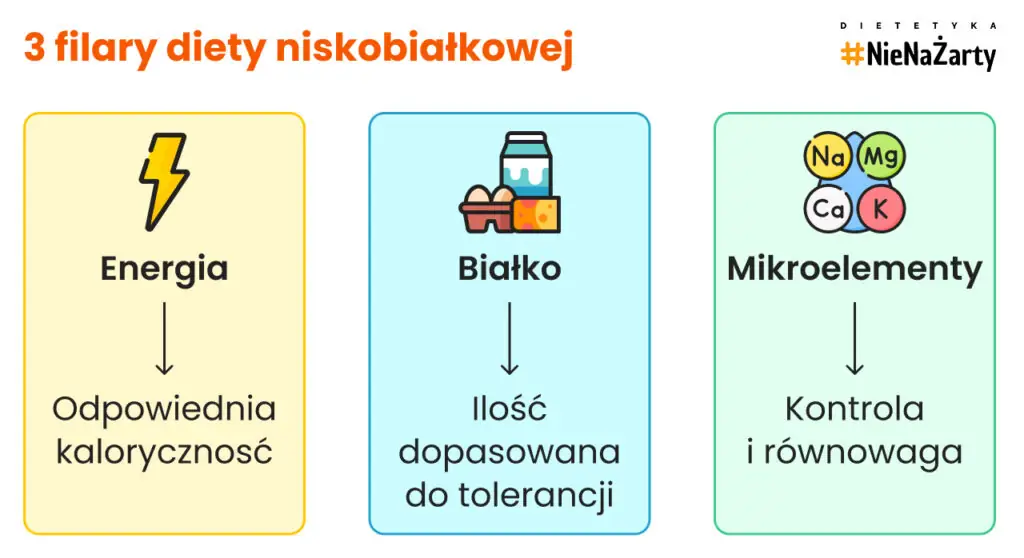 Skuteczna dieta niskobiałkowa nie opiera się na przypadkowych wyborach. Jej planowanie można sprowadzić do trzech kluczowych filarów: odpowiedniej ilości energii, kontroli białka oraz dbałości o mikroelementy. Dopiero połączenie tych trzech elementów pozwala prowadzić dietę bezpiecznie i bez ryzyka niedoborów.