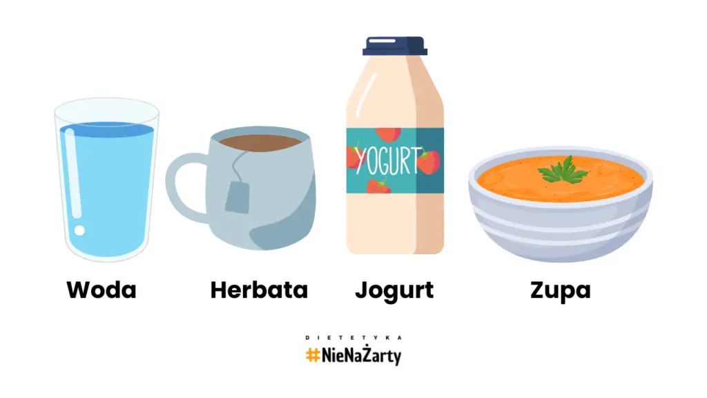- Herbaty ziołowe, woda i inne bezbarwne napoje – ważne jest, aby napoje nie zawierały cukru, barwników ani miazgi.