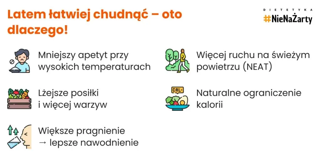 • Latem naprawdę łatwiej schudnąć – mniejszy apetyt, więcej ruchu, więcej warzyw i owoców = naturalne warunki do redukcji masy ciała.