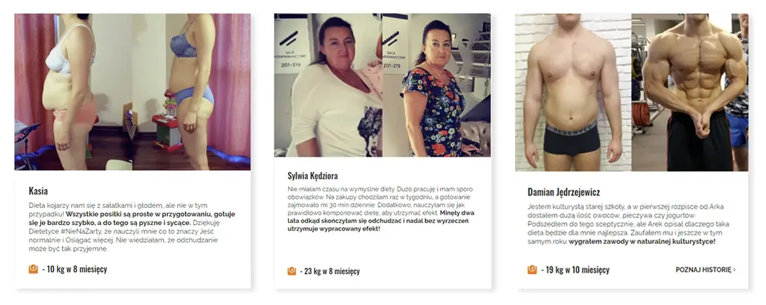- Nie podchodzimy do pacjentów wyłącznie jako dietetyk przepisujący dietę na kartce. Kształcimy swoją empatię i umiejętności miękkie, aby dokładnie zrozumieć Twoje potrzeby i pomóc Ci w najlepszy możliwy sposób. Spójrz na poniższe metamorfozy Pani Sylwii, Damiana i Kasi. Do każdego z trójki pacjentów musieliśmy dostosować nie tylko odpowiednią dietę, ale też odpowiednie podejście mentalne.