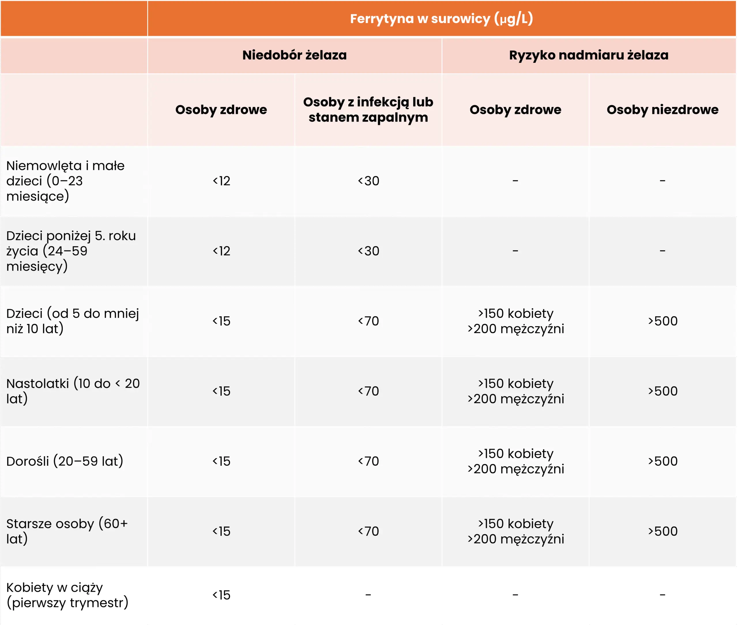 Światowa Organizacja Zdrowia (WHO) w 2020 roku opublikowała zalecenia dotyczące stosowania stężeń ferrytyny do oceny stanu żelaza w populacji. Autorzy proponują następujące podejście [9]: