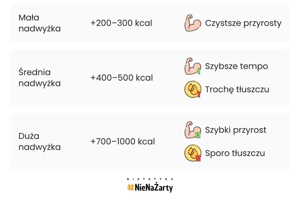 - Rozsądniejsze podejście to nadwyżka ok. +500 kcal dziennie, co daje przyrost ~0,5 kg tygodniowo. To tempo pozwala rosnąć, ale minimalizuje nadmierne otłuszczanie.