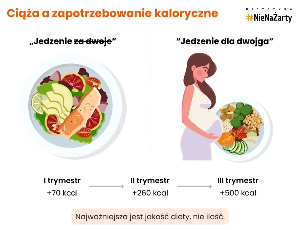 Najważniejsza jest jakość diety – dodatkowe kalorie powinny pochodzić z pełnowartościowych produktów: białka, zdrowych tłuszczów, wapnia, żelaza czy kwasów omega-3, a nie z pustych kalorii. Dlatego lepiej „jeść dla dwojga, a nie za dwoje”.