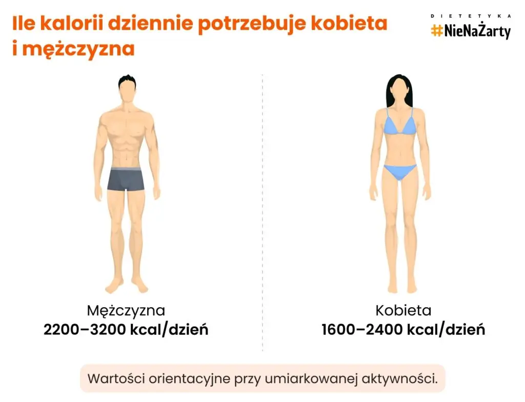 - Średnio: kobiety 1600–2400 kcal, mężczyźni 2200–3200 kcal (umiarkowana aktywność).
