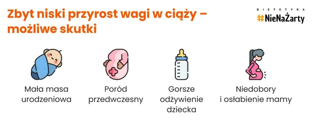 - Zbyt niski przyrost masy ciała może skutkować niską masą urodzeniową dziecka, przedwczesnym porodem i osłabieniem organizmu mamy.