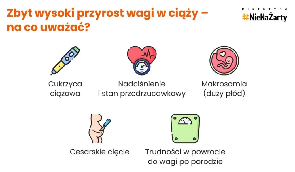 - Zbyt wysoki przyrost zwiększa ryzyko cukrzycy ciążowej, nadciśnienia, stanu przedrzucawkowego, makrosomii i porodu operacyjnego.