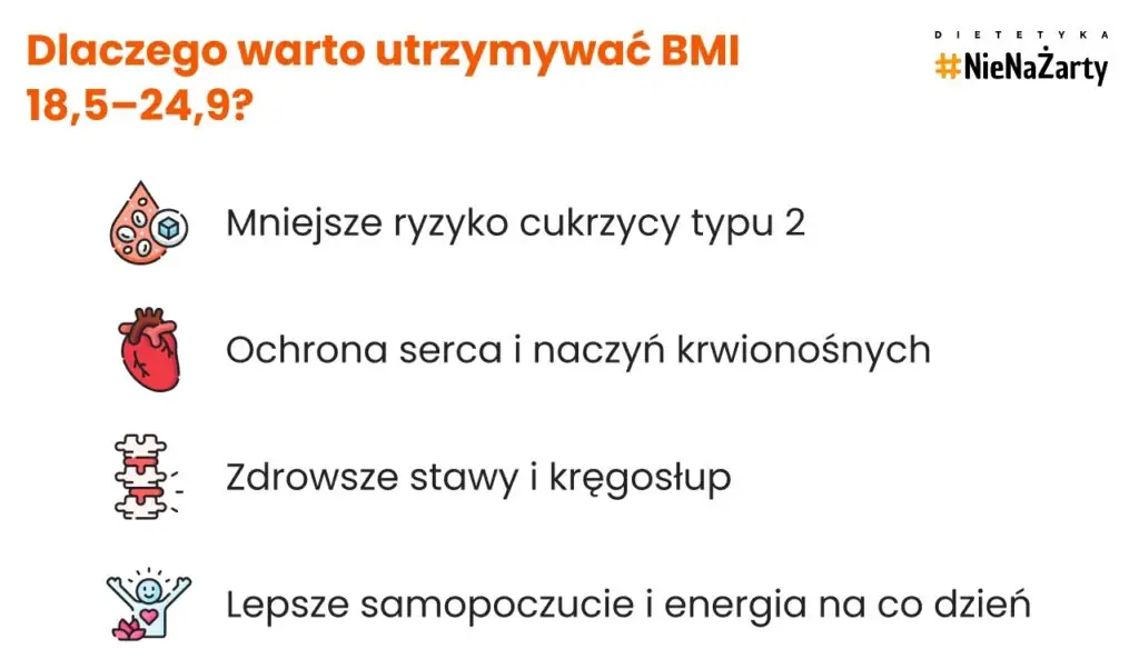 • Utrzymanie BMI w normie to realna korzyść dla zdrowia – lepsze ciśnienie, kondycja serca i stawów, niższe ryzyko chorób cywilizacyjnych.