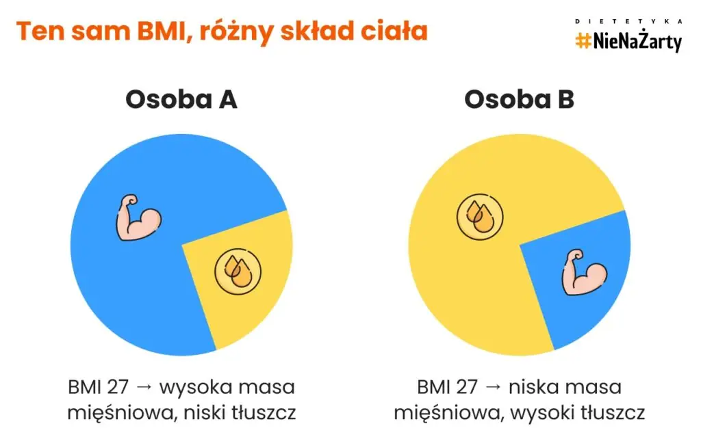W takich sytuacjach nie zaleca się używać BMI jako jedynej miary. Lepiej wykonać analizę składu ciała (np. pomiar impedancji BIA) albo zmierzyć obwód talii. BMI jest przydatny u przeciętnego odbiorcy, ale u osób z rozwiniętą masą mięśniową wyniki traktuje się ostrożnie. Mężczyźni trenujący siłowo często usłyszą, że „BMI wskazuje nadwagę”, podczas gdy faktycznie mają niewiele tłuszczu. Odwrotnie u osób starszych czy po chorobie – mogą mieć BMI w normie, ale niski udział mięśni. Stąd w pełnej ocenie stanu zdrowia nie powinno się polegać wyłącznie na BMI.