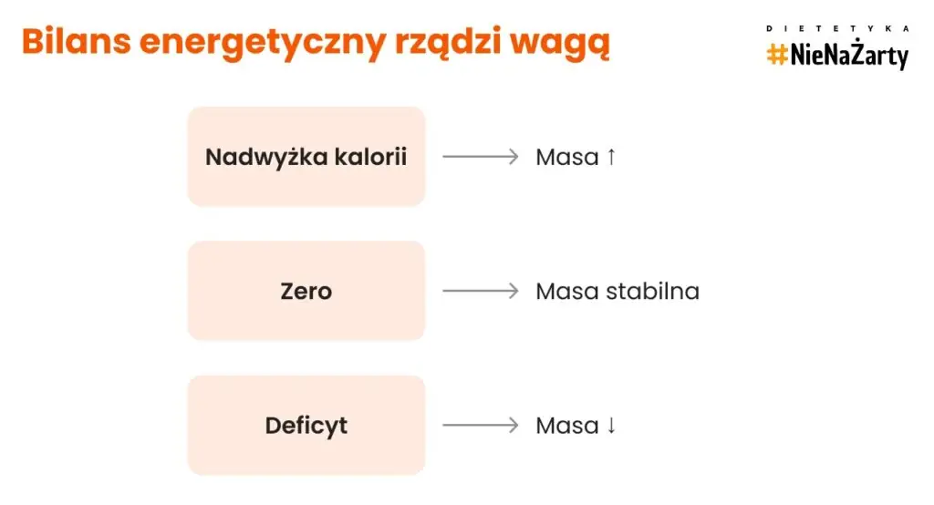 - Bilans energetyczny rządzi wagą – aby schudnąć, trzeba jeść mniej kalorii, niż się spala.