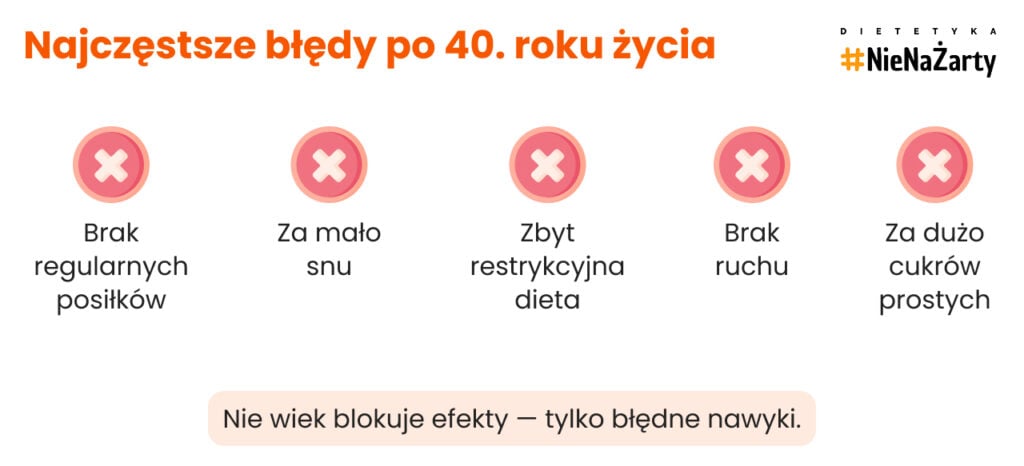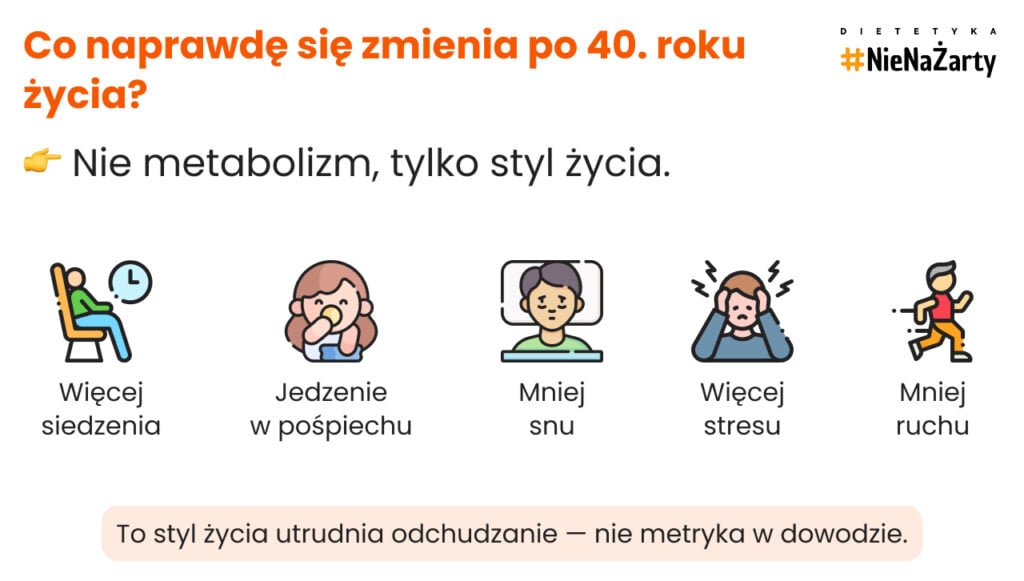 • Metabolizm po 40. nie spada gwałtownie – zmienia się styl życia, nie możliwości organizmu.