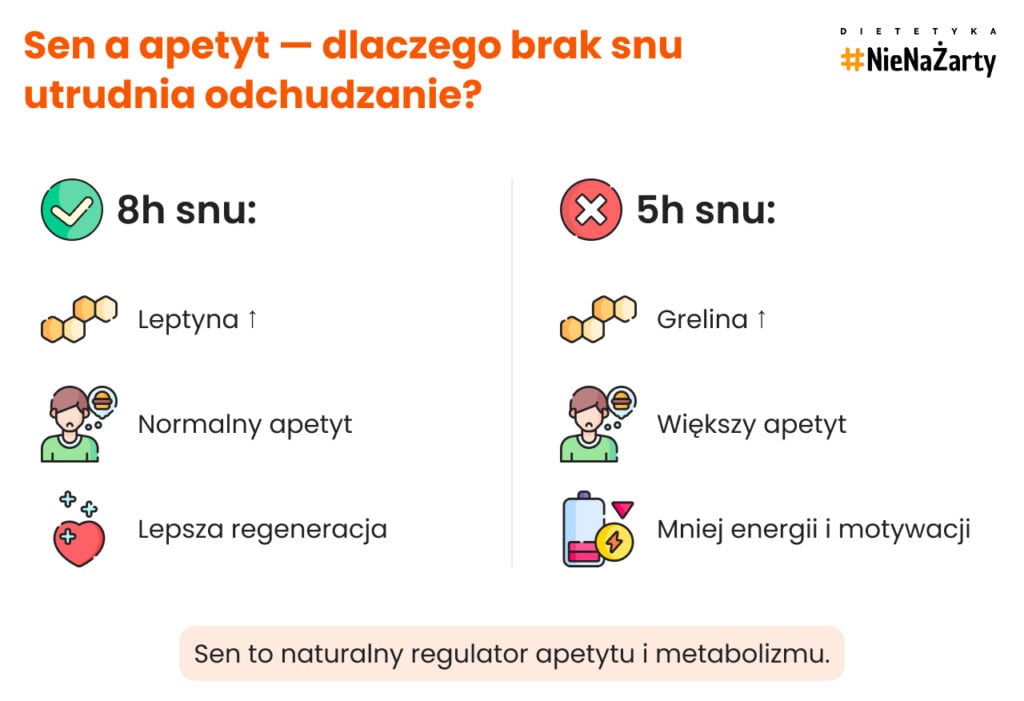 • Sen i regeneracja są tak samo ważne jak dieta – brak snu zaburza hormony głodu i sytości.