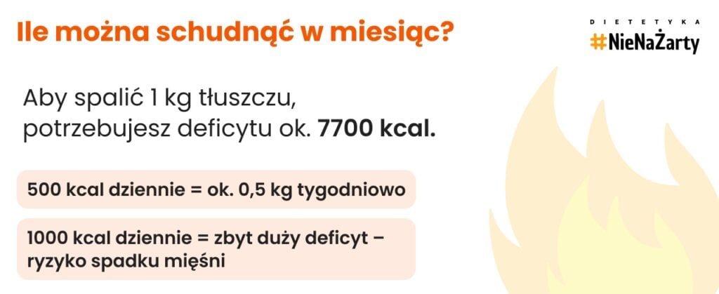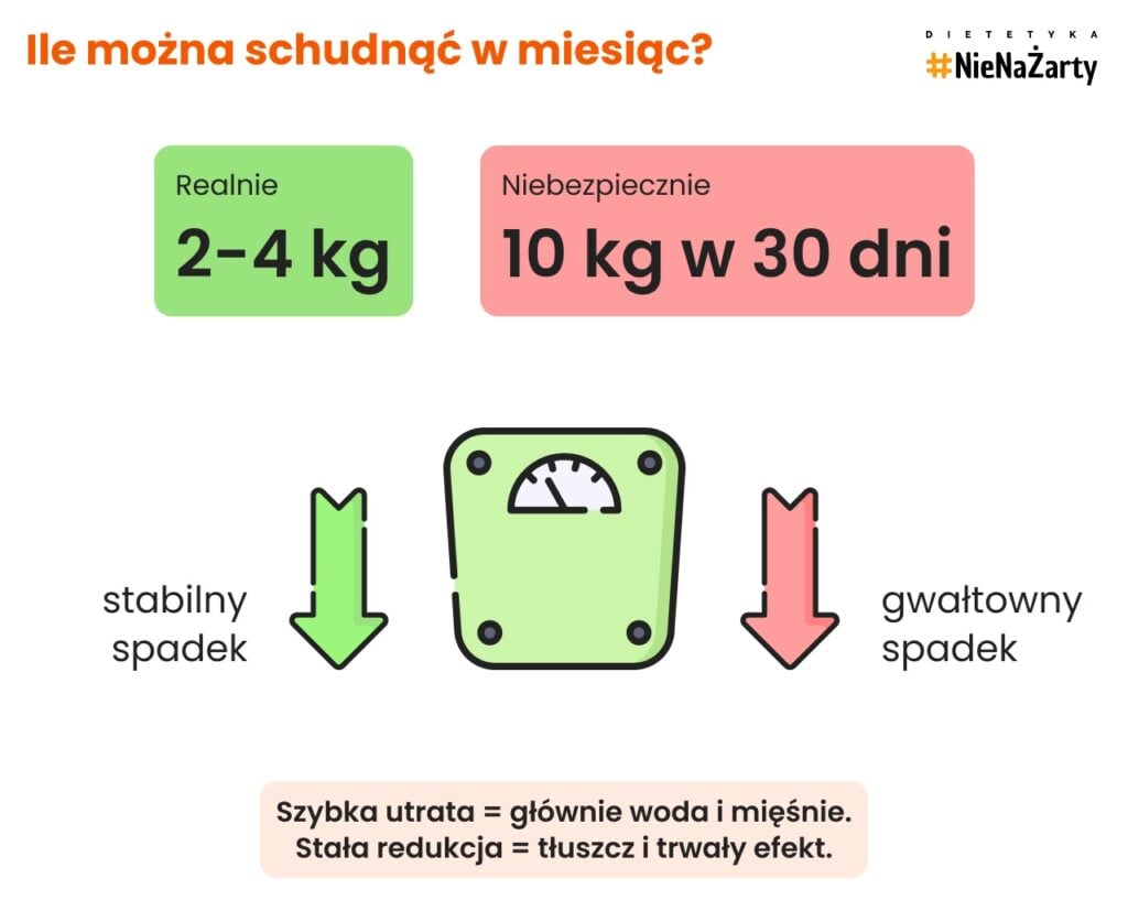- Realne tempo redukcji to 0,5–1 kg tygodniowo, czyli około 2–4 kg w miesiąc. Takie tempo pozwala spalać głównie tkankę tłuszczową, a nie mięśnie czy wodę.