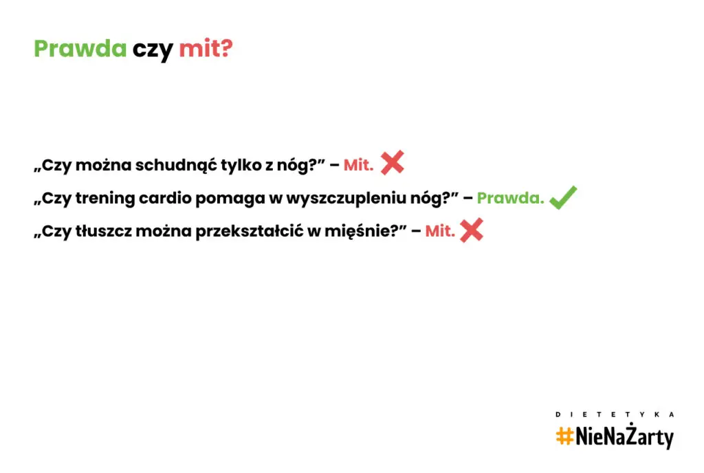 • Aby schudnąć z nóg, konieczne jest połączenie deficytu kalorycznego z aktywnością fizyczną. Trening nóg, choć nie prowadzi do miejscowego odchudzania, skutecznie poprawia wygląd tej partii ciała. Ćwiczenia takie jak przysiady, wykroki, mostki czy trening z gumami oporowymi wzmacniają uda i pośladki. Bieganie, jazda na rowerze oraz trening interwałowy wspomagają spalanie tkanki tłuszczowej.
