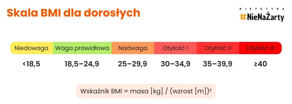 (Im bliżej dolnej granicy zakresu, tym bliżej niedowagi; im bliżej górnej granicy – tym bliżej nadwagi.)