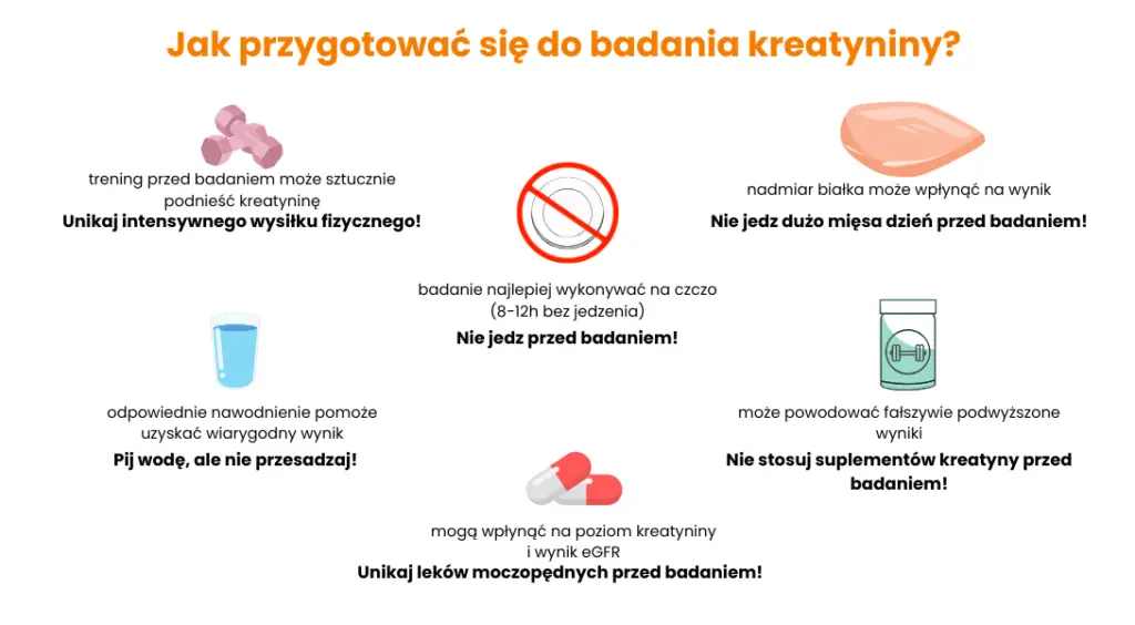 - Przygotowanie do badania ma znaczenie dla wiarygodności wyników – warto unikać intensywnego wysiłku, nadmiernego spożycia mięsa i diuretyków oraz być na czczo przed pobraniem krwi.