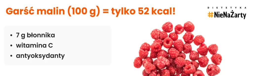 Szklanka malin to ok. 80 kcal i dużo błonnika, który syci i hamuje podjadanie. Zawierają też keton malinowy – związek badany pod kątem wspomagania metabolizmu tłuszczów.