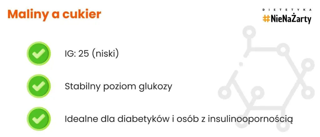 Niski IG (~25) i wysoka zawartość błonnika sprawiają, że maliny nie powodują gwałtownych skoków glukozy – to świetny owoc dla diabetyków i osób z insulinoopornością. [6]