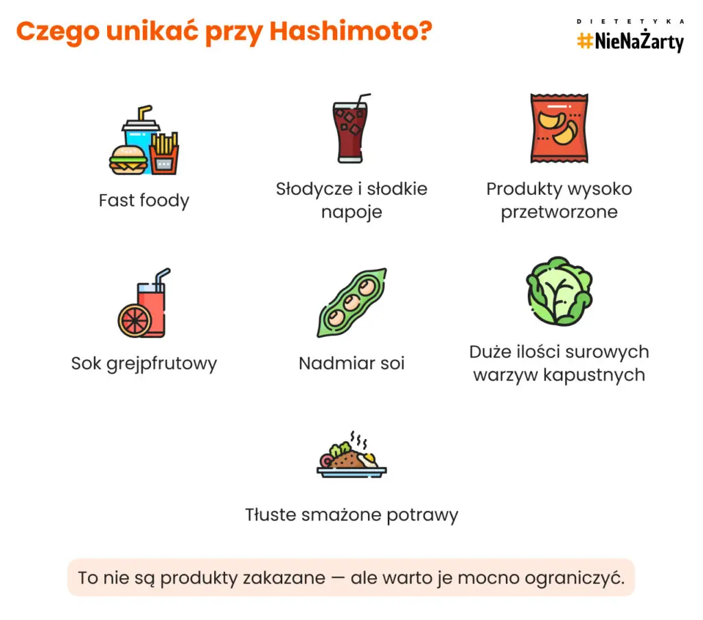 Produkty pełne dodatków, cukrów i tłuszczów trans nasilają stan zapalny i utrudniają kontrolę glukozy. To szczególnie istotne, bo Hashimoto często współwystępuje z insulinoopornością.