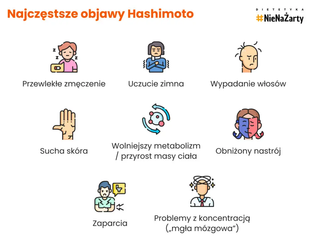 Przebieg Hashimoto jest etapowy — od fazy bezobjawowej, przez fazę przeciwciał, aż po jawną niedoczynność tarczycy. Objawy takie jak przewlekłe zmęczenie, uczucie zimna, suchość skóry czy zwiększenie masy ciała pojawiają się dopiero w zaawansowanej fazie.