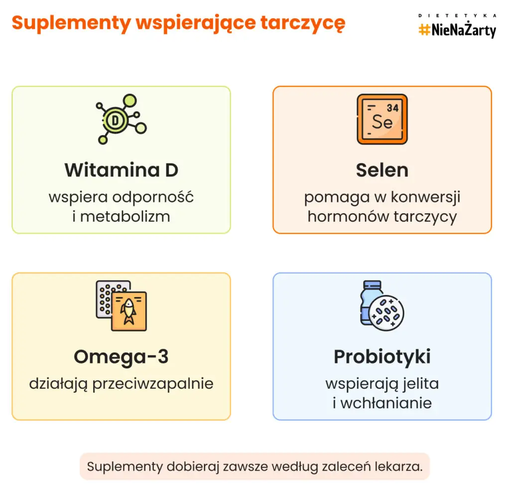 - Suplementacja (witamina D, selen, omega-3) może wspomagać terapię, jeśli jest dobrana do potrzeb.