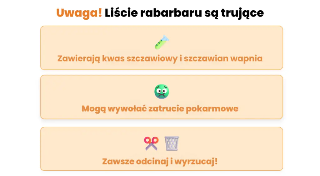 Szczególnie niebezpieczne są liście rabarbaru, które zawierają najwyższe stężenia szczawianów i są toksyczne – nie nadają się do spożycia w żadnej formie.