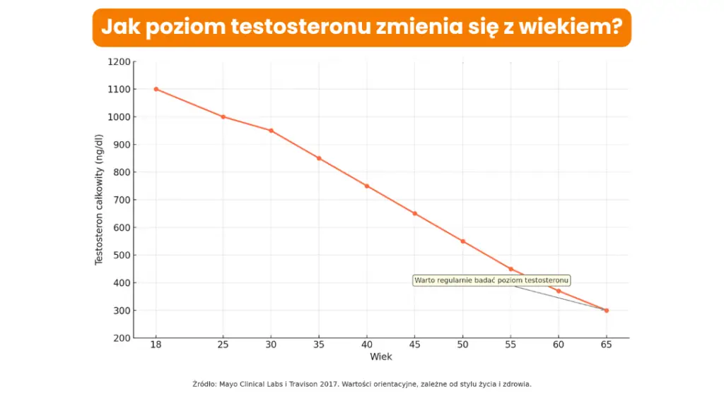 Poziom testosteronu u mężczyzn zmienia się z wiekiem – to naturalne zjawisko, które może, ale nie musi, prowadzić do objawów niedoboru. Najwyższe stężenie testosteronu obserwuje się zazwyczaj w wieku 18–25 lat, a później hormon ten powoli zaczyna spadać. Ten spadek może być niezauważalny, ale u niektórych mężczyzn wywołuje zmęczenie, spadek libido, trudności z koncentracją czy pogorszenie formy fizycznej.