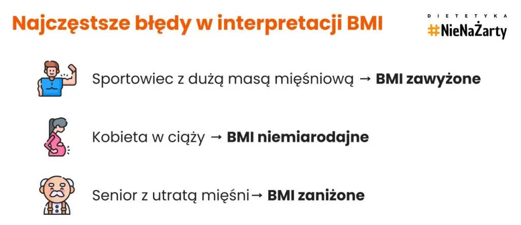 - Specyfika sytuacji – kulturysta może mieć BMI 30 i niski poziom tłuszczu, a modelka BMI 18, które medycznie oznacza niedowagę.