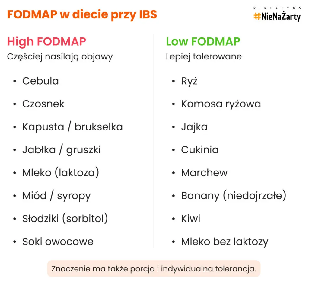 Dlatego w przypadku IBS tak istotne jest świadome dobieranie produktów, obserwacja reakcji organizmu oraz — w wielu przypadkach — zastosowanie odpowiednio dobranej diety low FODMAP, która pomaga ograniczyć czynniki nasilające objawy jelitowe.