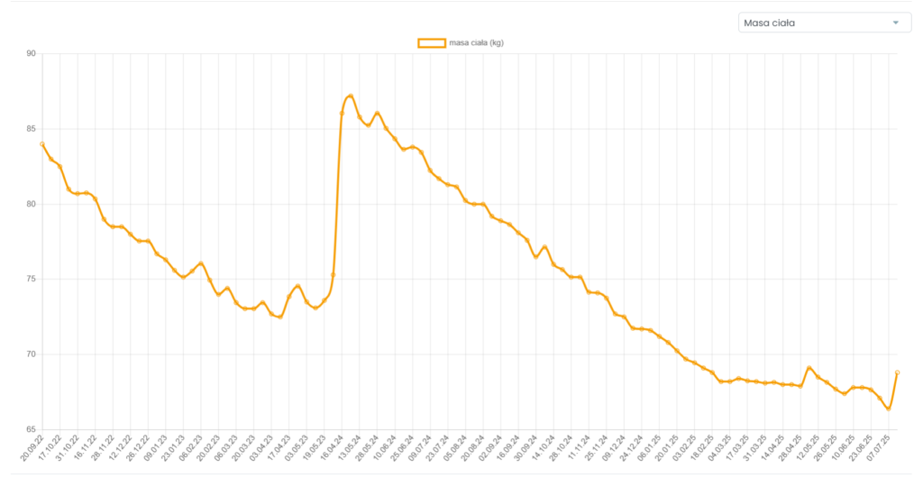 Kasia zgłosiła się z celem redukcji tkanki tłuszczowej, poprawy relacji z jedzeniem oraz wypracowania i utrwalenia zdrowych nawyków żywieniowych. Dodatkowo zmagała się z jedzeniem emocjonalnym, co utrudniało jej utrzymanie regularności i poczucia kontroli nad dietą. Jej sytuacja zdrowotna była wieloaspektowa – ma IBS, objawiające się zarówno biegunkami, jak i zaparciami. Ponadto zmaga się z depresją, niedoczynnością tarczycy, wysokim cholesterolem oraz niskim libido.