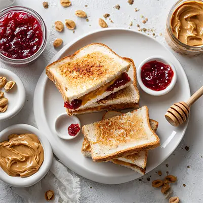 Kanapki – z masłem orzechowym i dżemem, pudding proteinowy